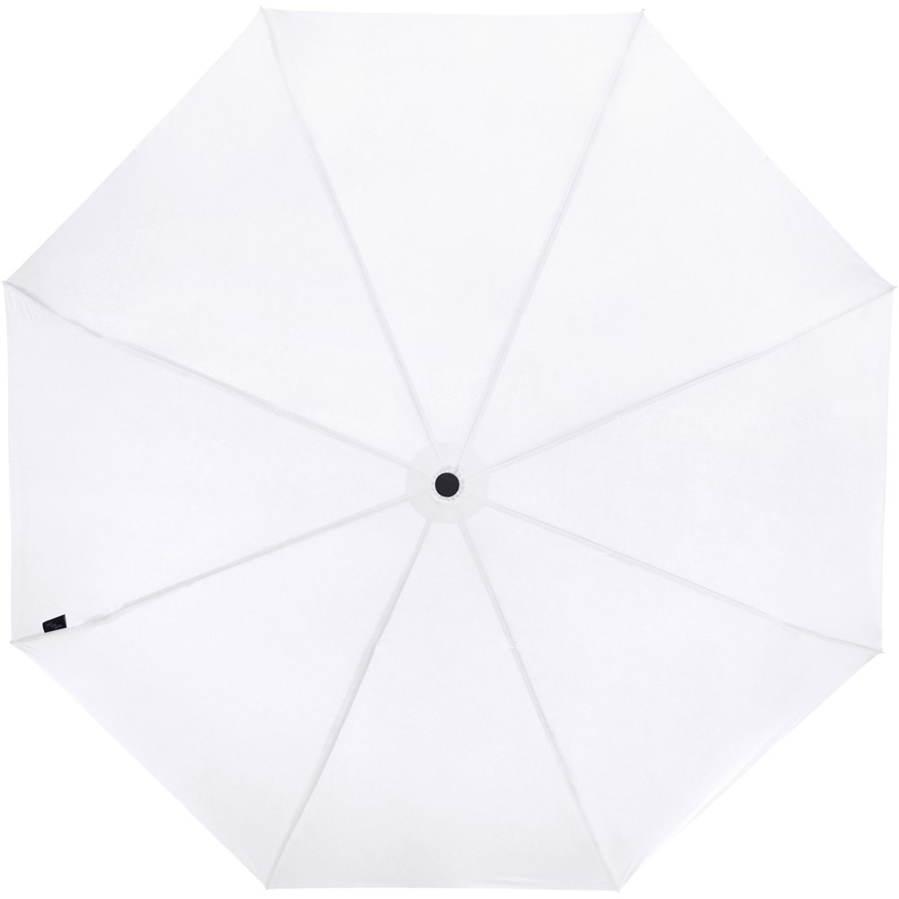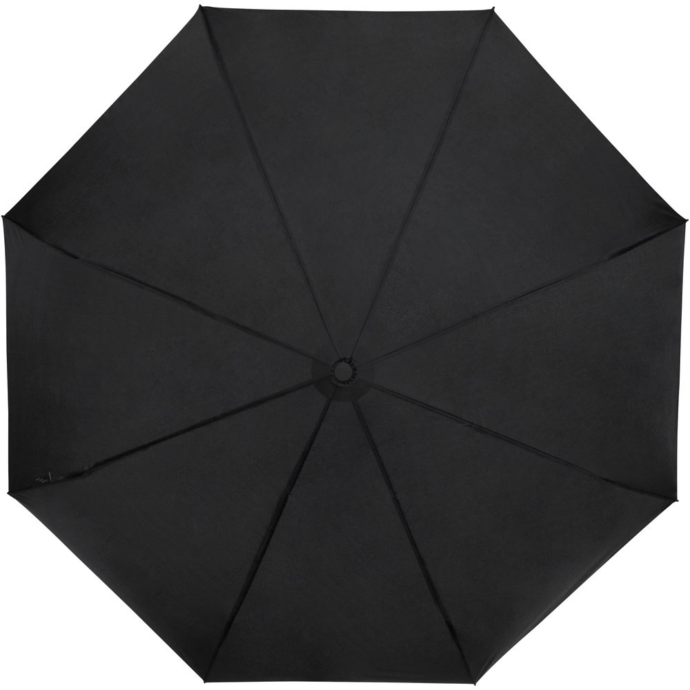 Handmatige opvouwbare paraplu met een canopy van gerecycled PET pongee polyester en een houten handvat. De stevige metalen steel en het hoogwaardige frame met fiberglass ribben bieden maximale flexibiliteit bij winderige omstandigheden. De paraplu wordt geleverd met een pouch en past gemakkelijk in een handtas of rugzak voor handige draagbaarheid. Met het houten handvat en de canopy van gerecycled PET pongee polyester biedt deze paraplu een duurzamere keuze.