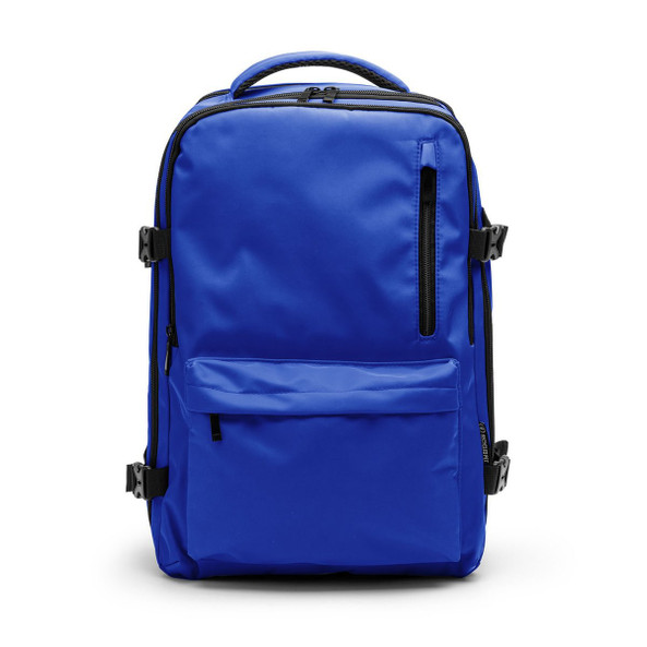 Travel computer backpack suitable as carry-on luggage, made of durable water-resistant recycled RPET polyester. Large main compartment with zip closure, internal pocket for 16" laptop. Internal pocket with waterproof PEVA lining. Security pocket on the back. Padded handle and shoulder straps. Strap to attach it to a trolley.