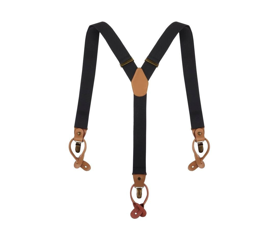 Dimensions: 3.5 x 120 cm. Elastic straps and practical clamps in old brass to adjust the length. Fastening to trousers either with genuine leather loops for buttoning (set of buttons not included) or with clips in old brass. Y-shape: 2 straps at the front, 1 strap at the back. High-quality genuine leather applications in cognac. Flap in the back made of genuine leather.