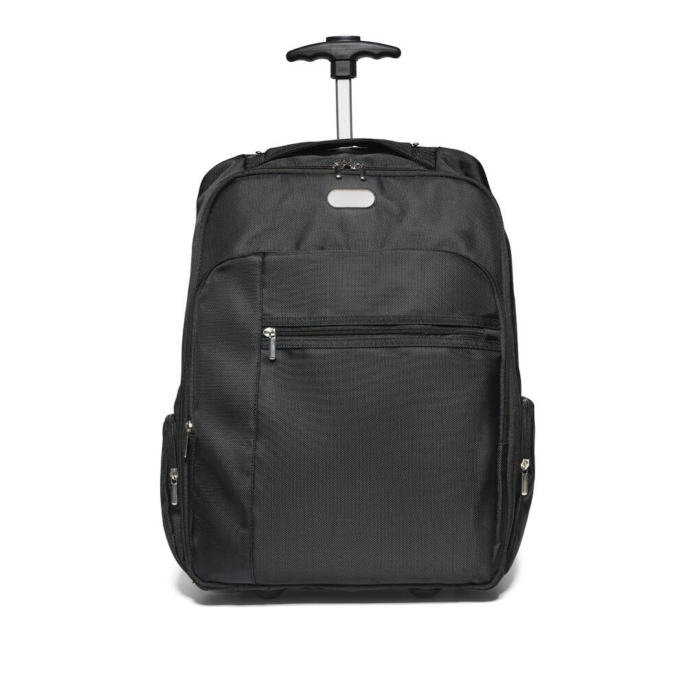 Laptop rugzak met trolley van polyester 1680D en 300D. De rugzak heeft een bekleed hoofdvak met gewatteerd scheidingsvak geschikt voor een laptop tot 17". Het heeft 2 voorvakken en 2 zijvakken met ritssluiting. Inclusief beschermhoes voor de wielen. De schouderbanden zijn gewatteerd en het uitschuifbaar aluminium handvat is voorzien van springveer. Bevat een verwijderbare magnetische metalen plaat voor eenvoudige aanpassing. De rugzak heeft een volumecapaciteit tot 28 L en weegt 1,80 kg. Personaliseerbare metalen plaat met lasertechniek apart geleverd