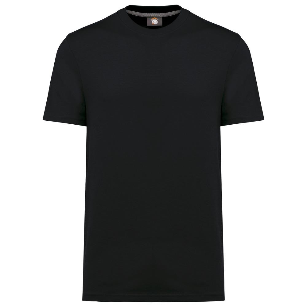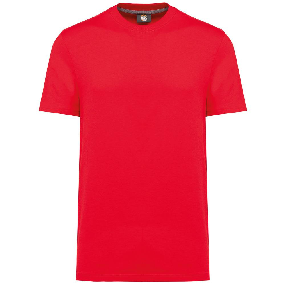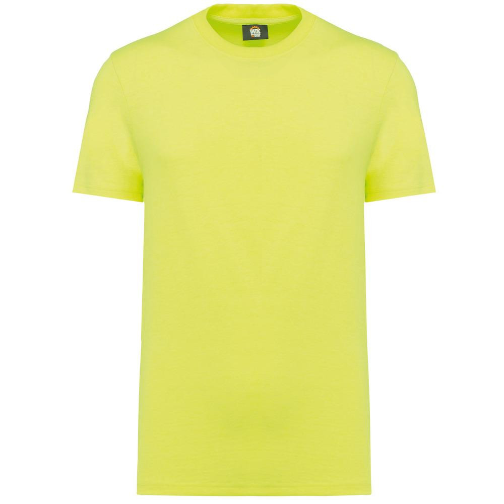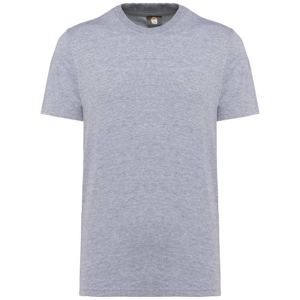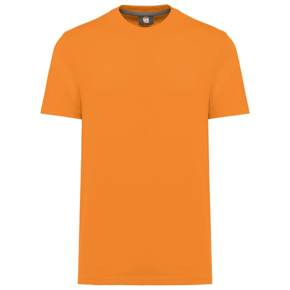 Ronde halsopening in 2x1 ribboord met elasthan en oranje nektape op de effen en gevlamde kleuren en toon-op-toon op de fluokleuren.