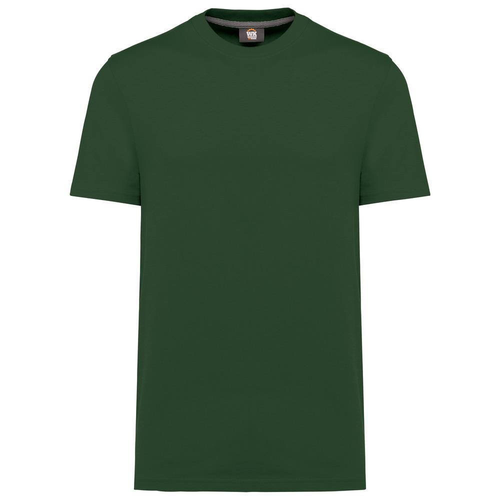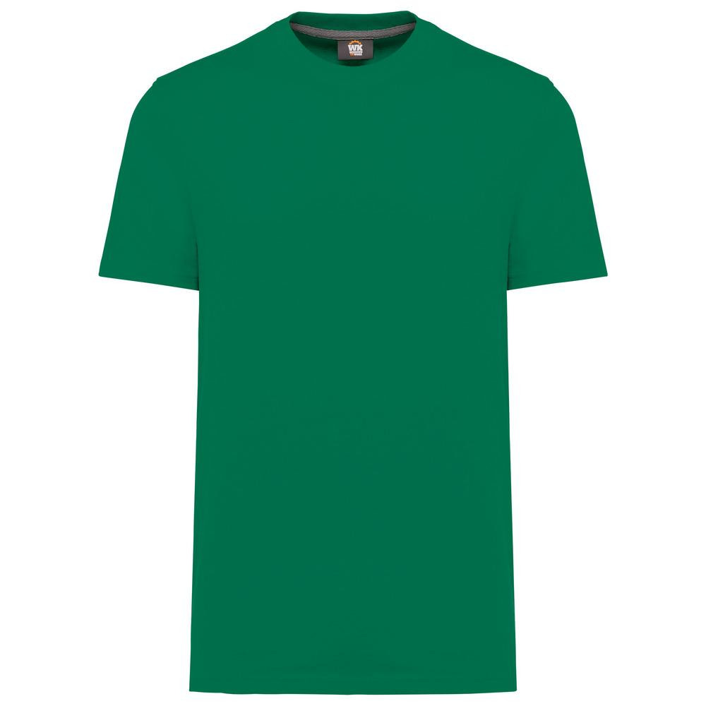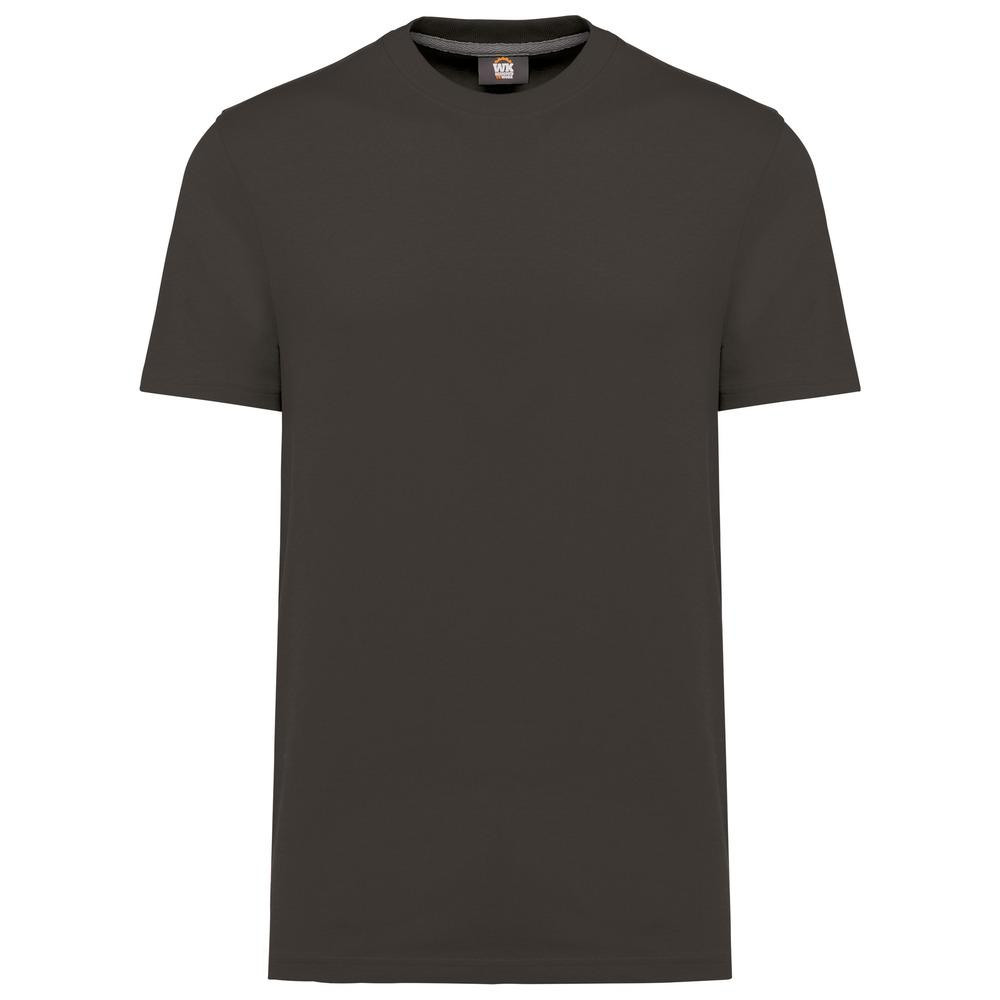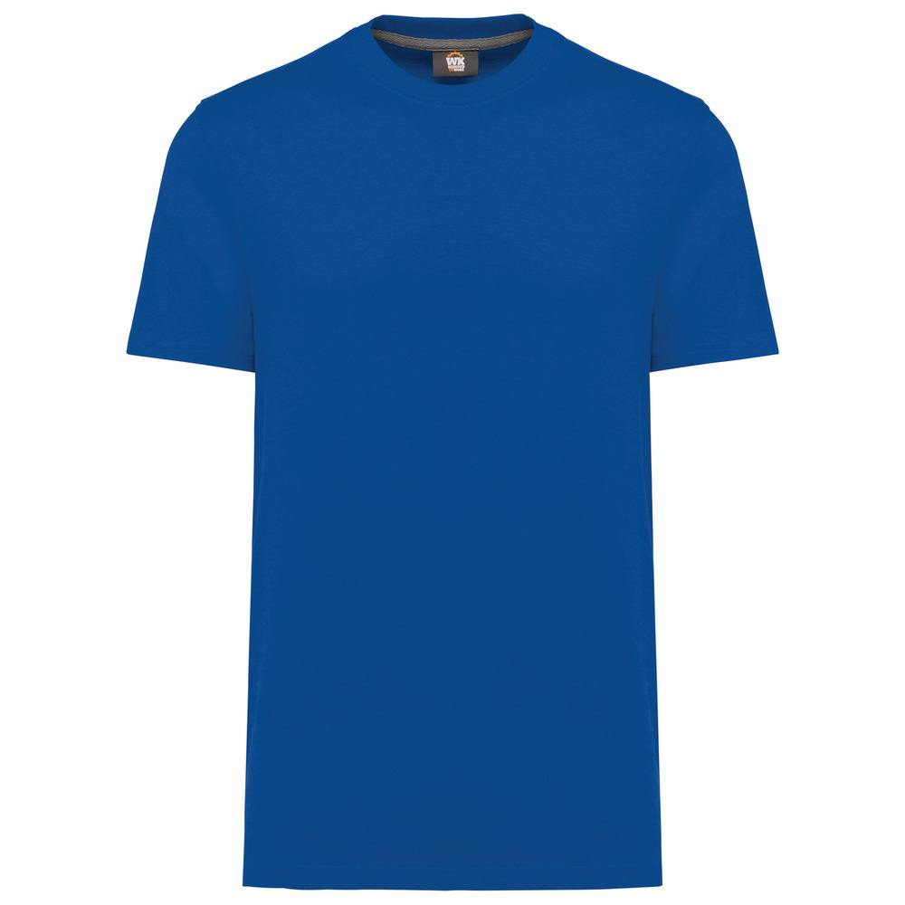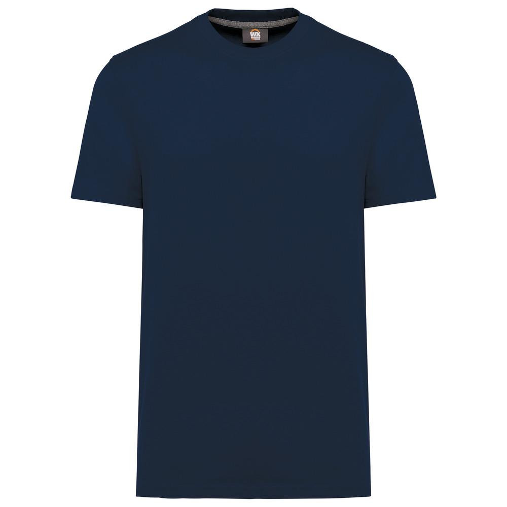 Ronde halsopening in 2x1 ribboord met elasthan en oranje nektape op de effen en gevlamde kleuren en toon-op-toon op de fluokleuren.