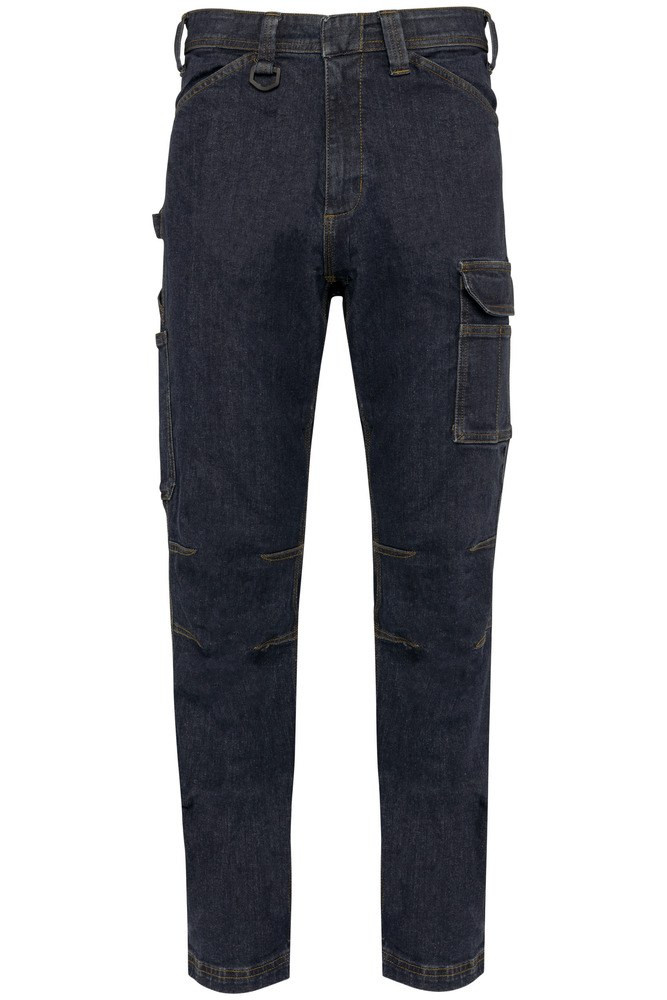 Driedubbele stiksels aan zijkanten, binnenkant been en kruis achteraan.